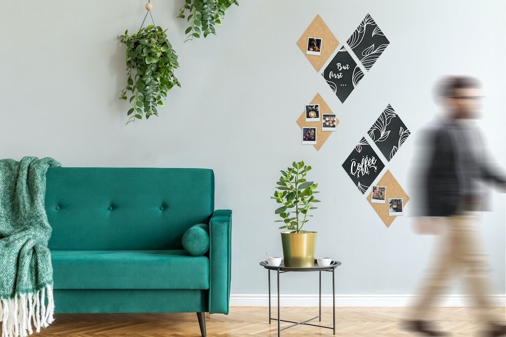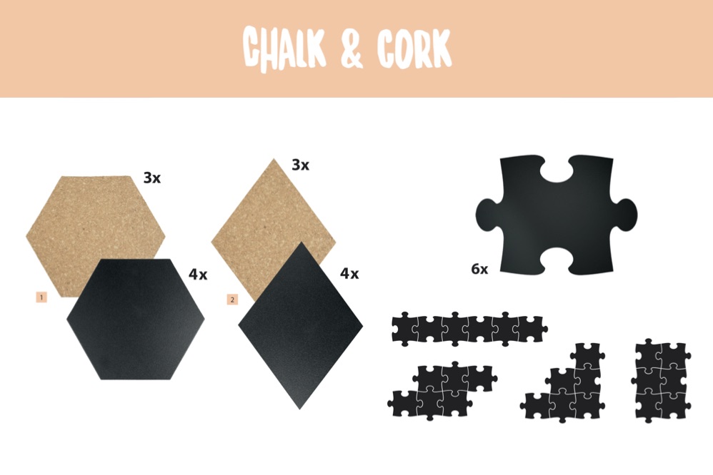 ダイヤモンド型とヘキサゴン型は、両面が無孔質の黒板と天然コルクピンボードの組み合わせ。